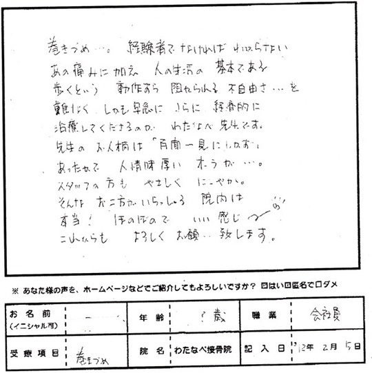 あの痛みに加え 人の生活の基本である 歩くという動作すら阻がられる不自由さ…を難なくしかも早急に さらに経済的に治療してくださるのがわたなべ先生です。
