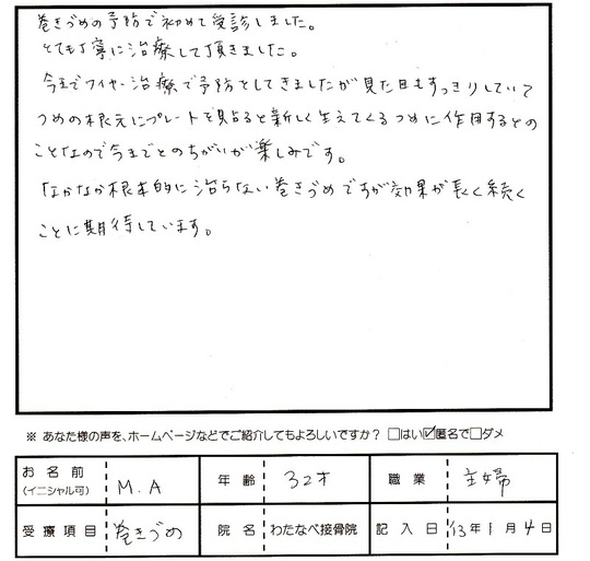 なかなか根本的に治らない巻きづめですが効果が長く続くことに期待しています。