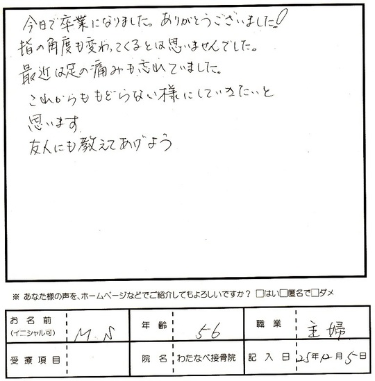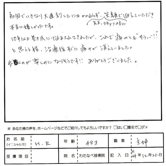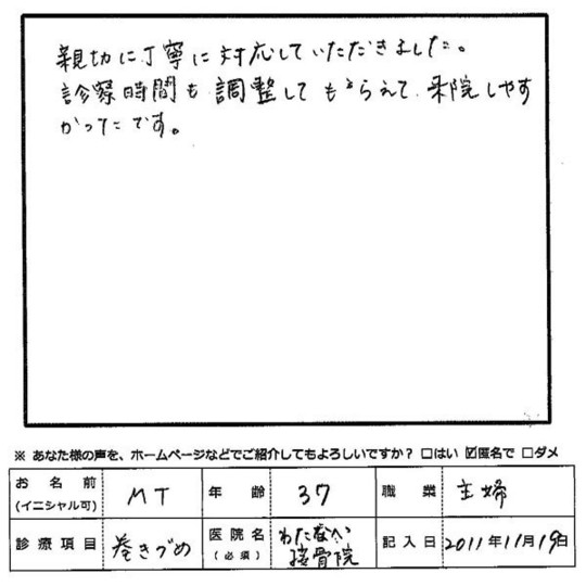 お帰りになられる際の痛みがなくなった時のお顔を見られて私も大変うれしかったです。