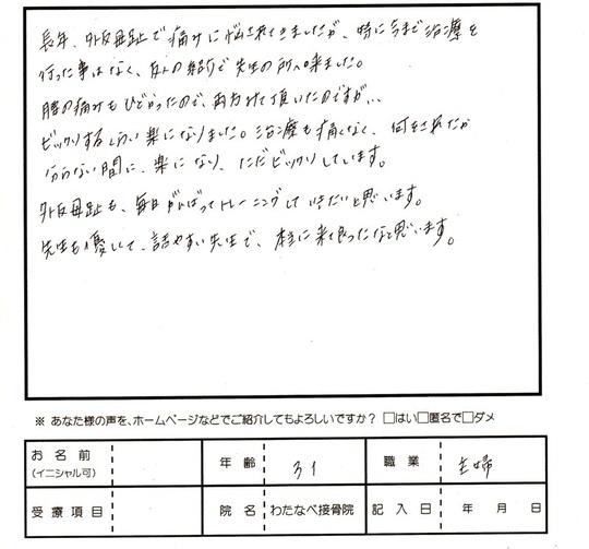 長年、外反母趾で痛みに悩まされてきましたが、特に今まで治療を
