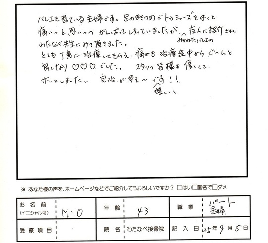 バレエを習っている主婦です。足のまきつめでトゥシューズをはくと痛いと思いつつがんばってきましたが、みかねたバレエの友人に紹介されわたなべ先生にみて頂きました。